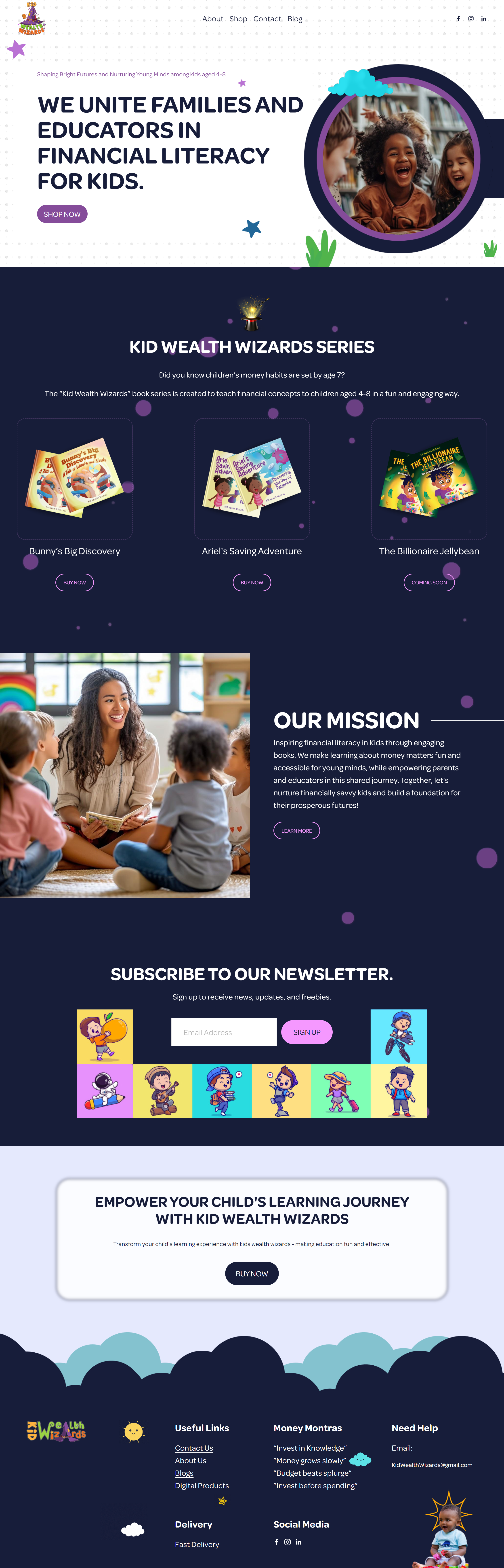 As the Billion Ideas team, we had the opportunity to help Kid Wealth Wizard bring this groundbreaking concept to life by designing a professional, user-friendly website. Our team focused on creating a clean and engaging platform that showcases the educational value of their products while maintaining an inviting and fun atmosphere for families. With easy navigation, bold visuals, and a seamless shopping experience, the website makes it simple for parents to find the right books for their kids. By blending professionalism with creativity, we ensured that Kid Wealth Wizard could effectively deliver their innovative idea to parents and educators looking to give children a head start on financial literacy.
